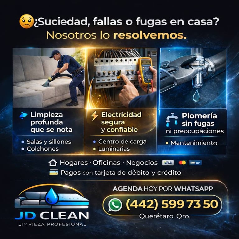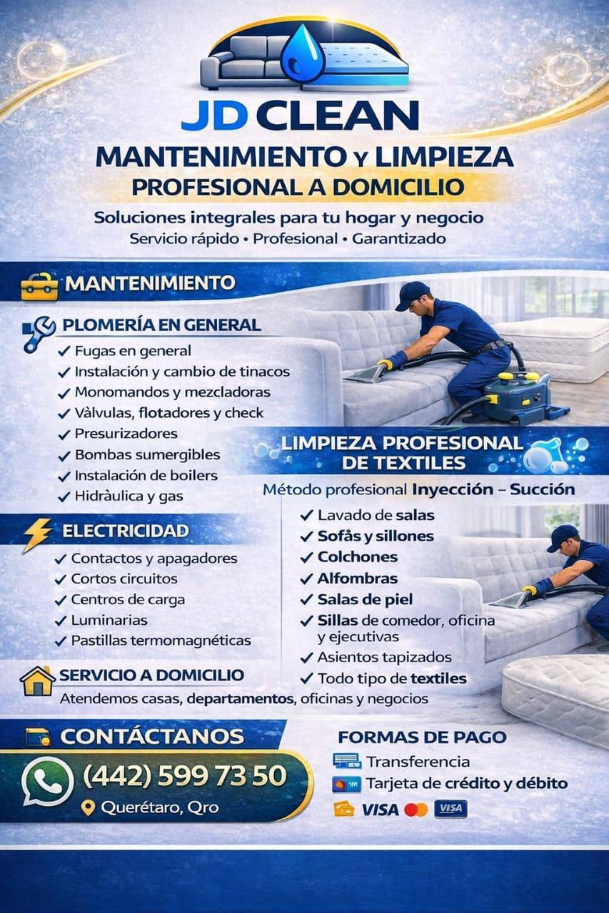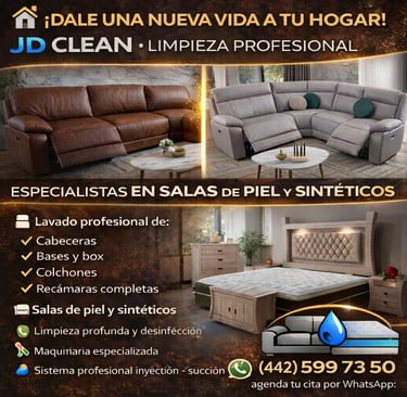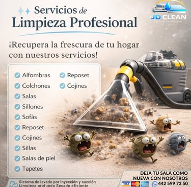 En JD Clean ofrecemos servicios profesionales de mantenimiento y limpieza especializada a domicilio en Querétaro, Qro. Nuestro compromiso es brindarte soluciones eficientes, atención puntual y resultados garantizados para que tu hogar o negocio siempre esté en óptimas condiciones.