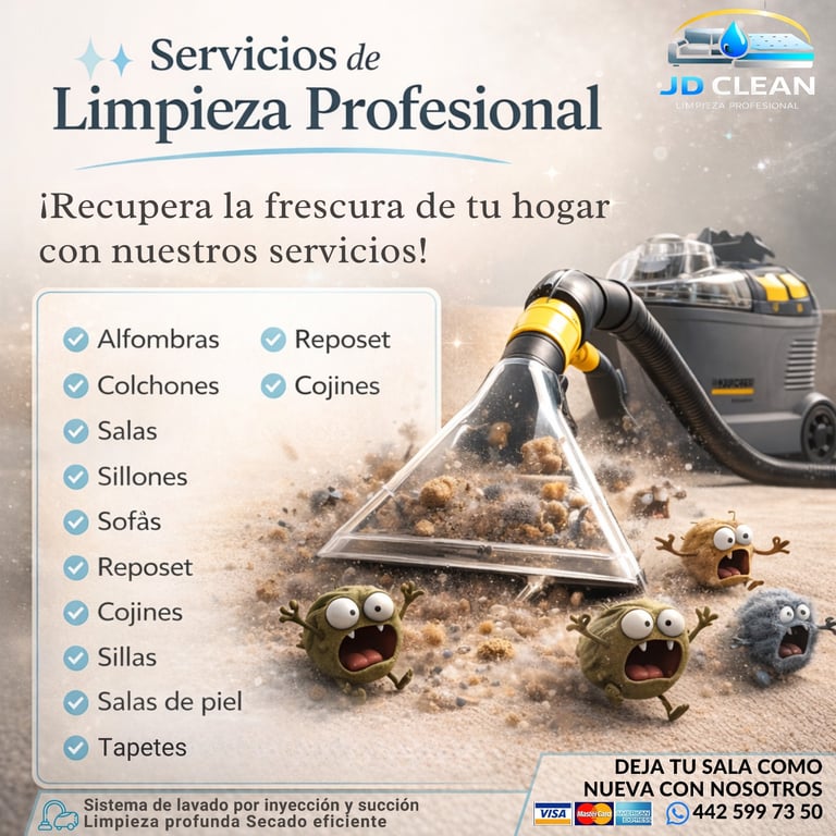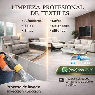 En JD Clean nos especializamos en servicios integrales que combinan mantenimiento técnico y limpieza profunda de textiles. Contamos con personal capacitado, herramientas profesionales y procesos seguros que garantizan calidad y satisfacción en cada servicio.